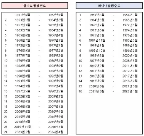 | 각 엘니뇨, 라니냐 시기에 피크점이 몇월 며칠인지 (예를 들어 17년 6월 1일이면 17.06.01) 표시 될까? 3개월 이상 연속된 엘니뇨가 아니고 5개월 이상 지속되는 경우로 바꿔줘. 라니냐도 마찬가지로. |