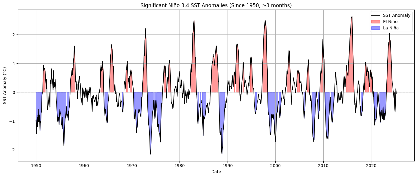 plt.title('Niño 3.4 SST Anomalies (Since 1950, ≥5 months El Niño / La Niña)')